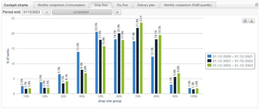 You will therefore need to obtain and analyse data such as the number of tanks that have run dry in a given month (“Dry Run” chart) or the distribution of tanks delivered according to the average unit delivery per year (“Drop Size” chart). This analysis enables you to see improvements in your logistics at a glance. This data and much more is easily accessible, in real time, in the Oil Link™ Cockpit chart, the cloud portal that collects, processes, analyses and graphically presents the data transmitted by our telemetry units.
